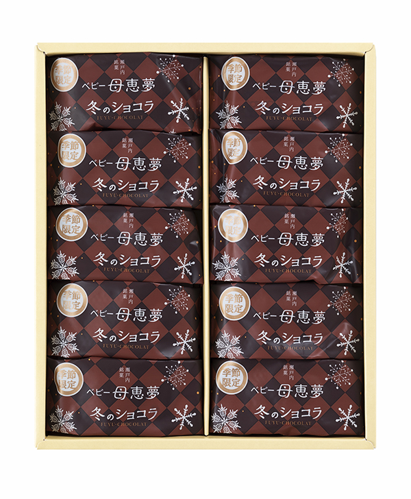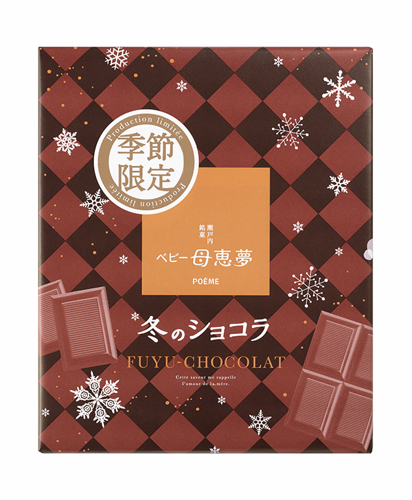 ベルギー産ショコラの贅沢な味わいを生かした 冬のベビー母恵夢。 黄味あんには上質なベルギー産ショコラをブレンド、 チョコの香りをまとった生地は、しっとりとした口どけです。 柔らかく濃厚な味わいが人気の一品です。
