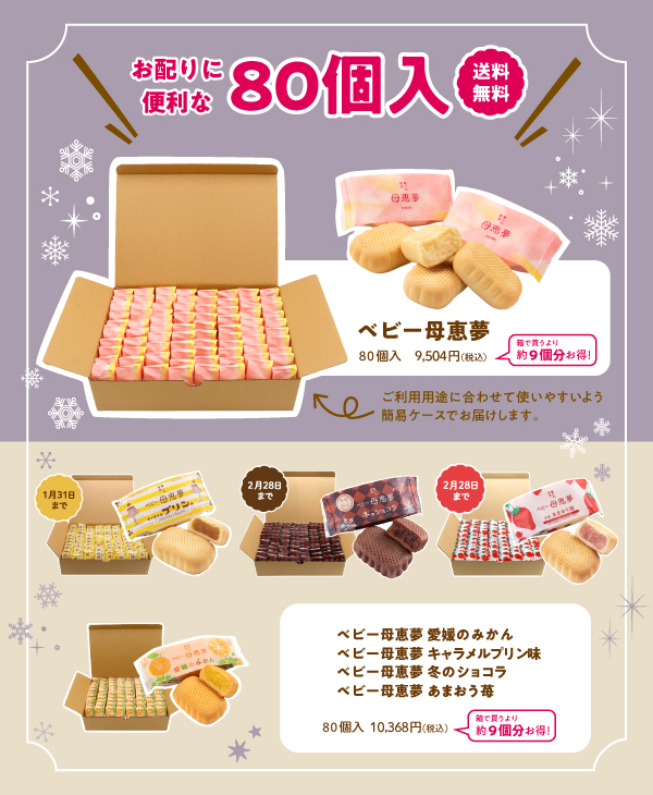通常よりお得な価格でお買い求めいただける「ベビー母恵夢80個入」を販売中!