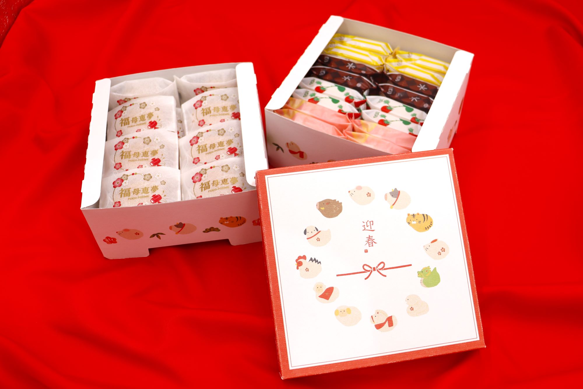 「母恵夢ゆく年くる年セット」は、1年の福を願う数量限定の詰合せ。 お正月限定の「福母恵夢」と、定番商品「ベビー母恵夢」、冬限定のベビー母恵夢キャラメルプリン味、 冬のショコラ、あまおう苺が計30個たっぷり入った、重箱をイメージした年末年始限定のセットです! 「母恵夢ゆく年くる年セット」で、ご家族やご親戚とのんびり年末年始をお過ごしください。