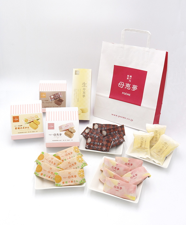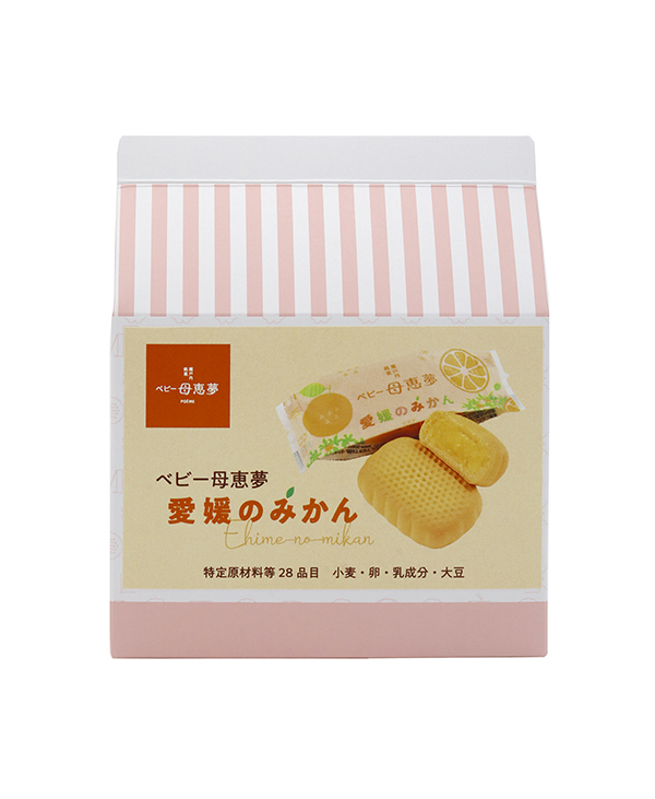 ベビー母恵夢愛媛のみかん温暖な風土に育まれた温州みかんとベビー母恵夢がひとつになった、さわやかな風味が広がる、愛媛ならではのお菓子をお楽しみください。
