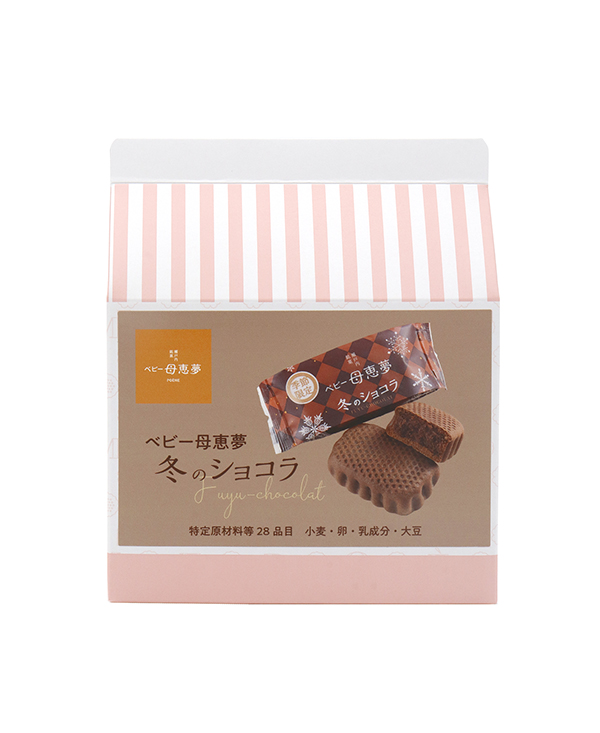【ベビー母恵夢 冬のショコラ】生餡(国内製造)、砂糖、小麦粉、卵、乳等を主要原料とする食品、チョコレート、準チョコレート、マーガリン、加糖練乳、バター、水飴、砂糖結合水飴、寒天加工品(麦芽糖、寒天)/トレハロース、着色料(カラメル、カロテノイド)、ベーキングパウダー、香料、乳化剤、酸化防止剤(V.E)、(一部に小麦・卵・乳成分・大豆を含む)