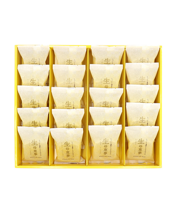 生地と餡が一体となった、なめらかな口どけの「生母恵夢」鳴門金時芋をベースにバターをたっぷり使った生地でアーモンドミルクを加えたしっとりとした黄味餡を包みました。スイーツパークでも大人気の「生母恵夢」をぜひご堪能ください。