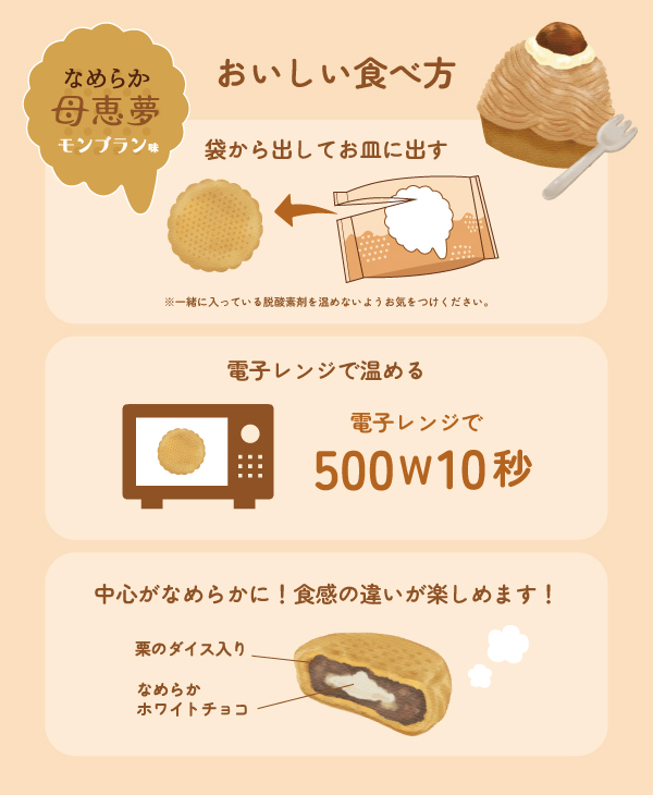 温めることで生地がさらにしっとり、中心がなめらかになって、食感の違いを感じられます。 出来立てのような栗の風味と口当たりの良さをお楽しみください。-