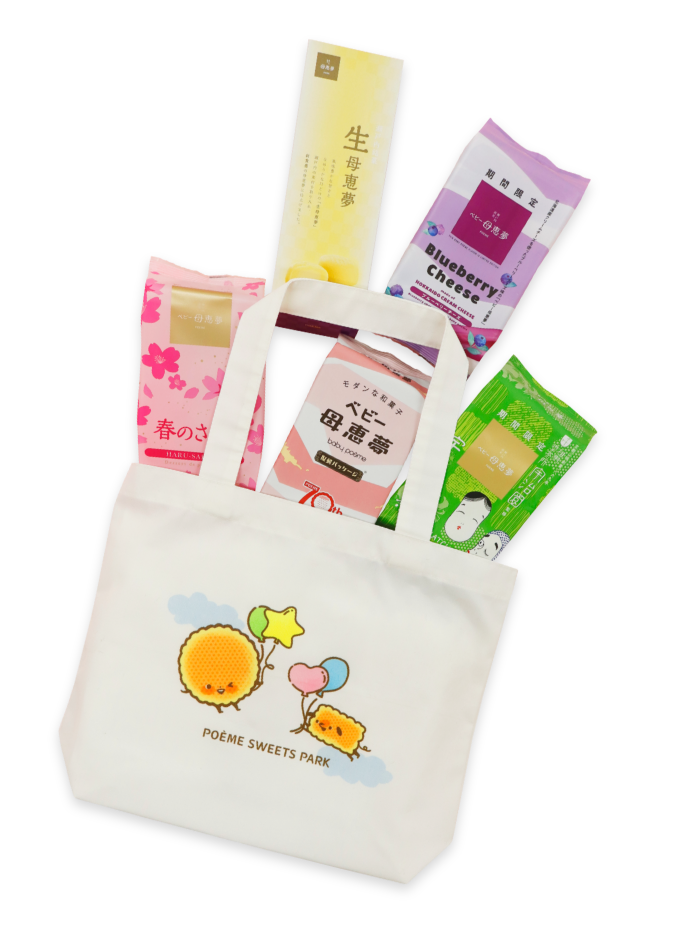 POEME Gift Bagは計10個入りの愛媛の名産品「みかん」をイメージした限定バッグ。スイーツパークオリジナルバッグは計9個入りのスイーツパークを連想させる可愛らしいデザインの限定バッグです。